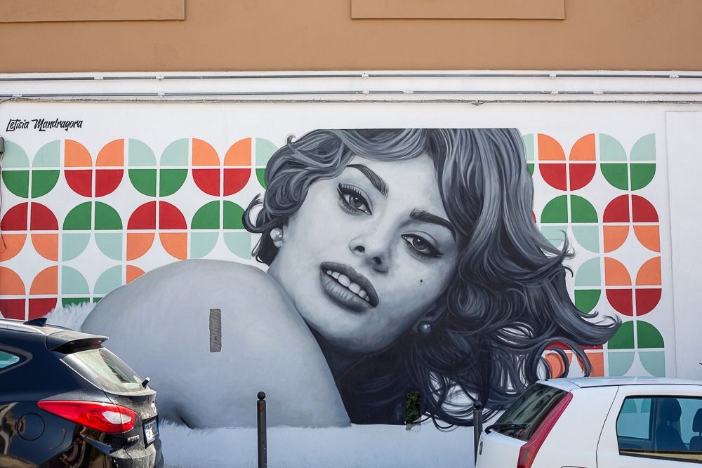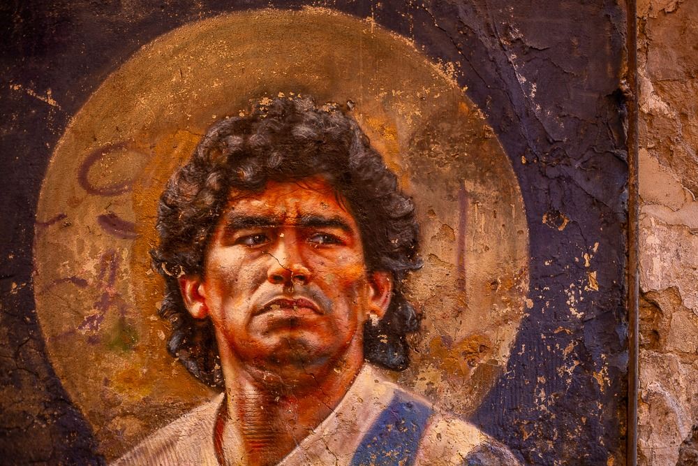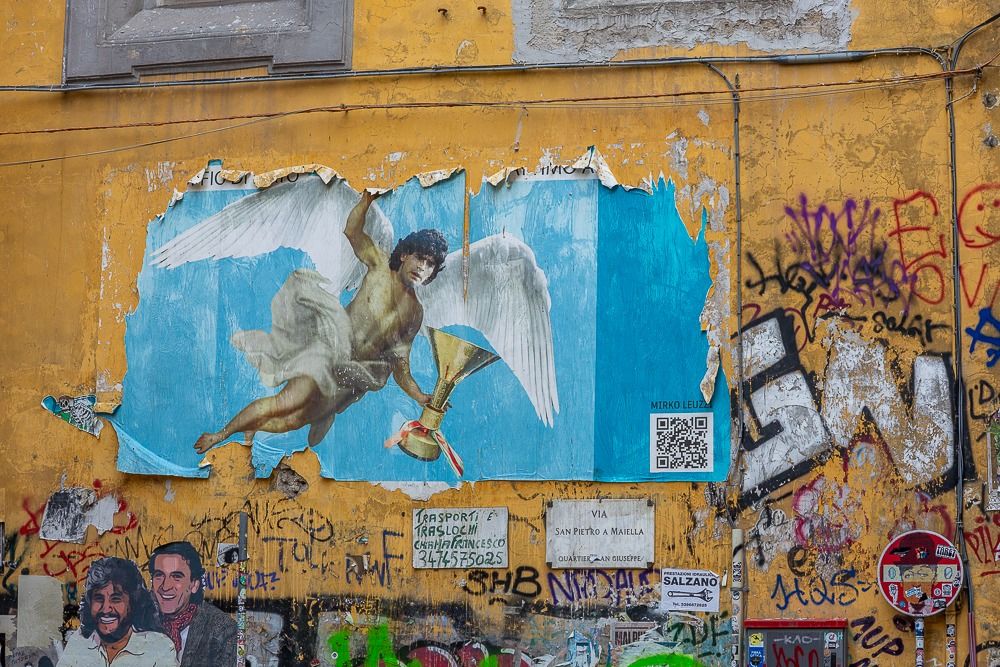 Häufig zu sehen sind das ikonische Gesicht der jungen Sophia Loren und das kantige Konterfei des neapolitanischen Komikers Totò. Und überall Diego Maradona, der, mit Glorienschein und Engelsflügeln ausgestattet, wie ein Heiliger verehrt wird.