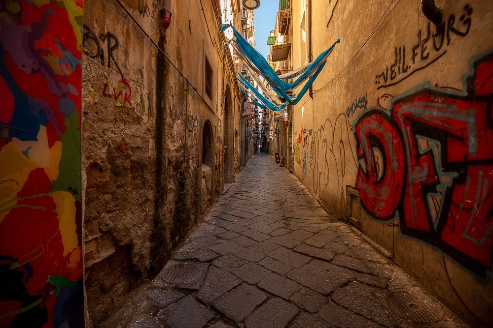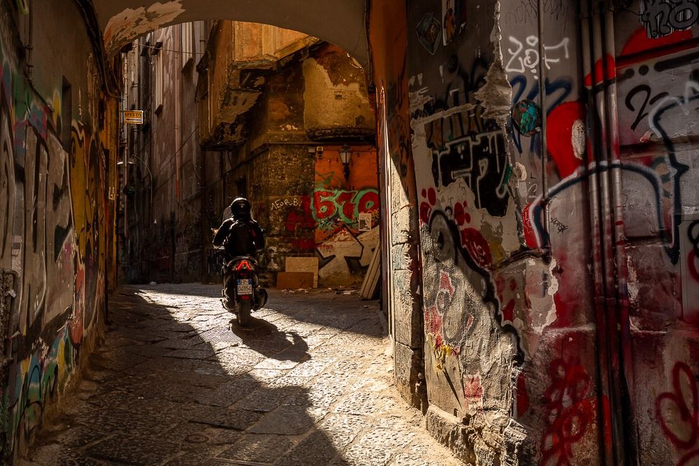 Und manchmal erhebt sich inmitten dieser vollgesprühten Häuserzeilen mit ihrem abblätternden Putz eine alte Kirche. Steinerne Heilige und Engel schauen auf das Treiben in den Gassen herunter; manche dieser Gotteshäuser sind geöffnet, andere mit schweren Eisenketten und dicken Schlössern verrammelt. Dazu überall Schreine mit Heiligenfiguren und Bildern geliebter Menschen. Und gleich nebenan, manchmal nahtlos aneinandergebaut, wird in einer kleinen Pizzeria die typisch neapolitanische Pizza mit dem fluffigen Rand und dem hauchdünnen Boden serviert. Das Religiöse und das Weltliche verschmelzen untrennbar miteinander.