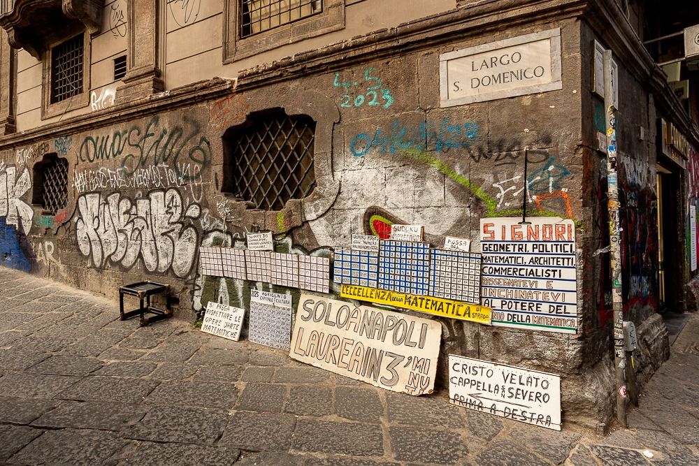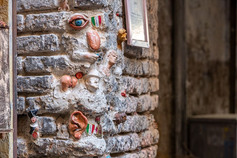 Ein sehr häufiges Motiv in den Altstadtgassen von Neapel ist Pulcinella. Diese sehr alte Figur des neapolitanischen Volkstheaters stellte oft einen listigen, aber auch tölpelhaften und gefräßigen Diener in den Stücken dar. Großartig, wie er auf einem Wandgemälde, den Pizzaschieber in einer Hand, Ronald McDonald mit der anderen ordentlich eine reinhaut!