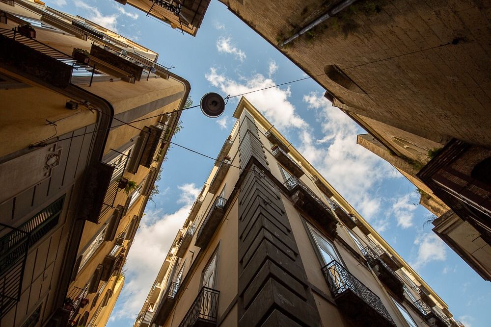 Der kleine Innenhof ist ähnlich vollgerümpelt wie unser Keller daheim und irgendwo in einem der oberen Stockwerke bellt schon den ganzen Morgen ein Hund. Eine unansehnliche Tür, die nicht vollständig zu schließen scheint, führt in eine enge, kopfsteingepflasterte Gasse. Als wir hinaustreten, muss ich für einen kurzen Moment stehenbleiben und diese ganze Fülle in mich aufnehmen. Schwatzende Menschen schlendern vorbei, manche wild gestikulierend und laut, andere ähnlich überfordert wie ich herumschauend, penetrant hupende Roller zwängen sich dazwischen durch, und überall kleine Geschäfte und Stände, die ihre teils kitschig bunten, teils nostalgischen Waren feilbieten. Der Geruch von frischem Espresso aus dem kleinen Café gegenüber, dessen Auslage mit gefüllten Croissants und sfogliatelle lockt, vermischt sich mit Parfum und dem unschönen Gestank von Großstadtgassen. Über unseren Köpfen ein stockwerkehohes Wirrwarr an Stromkabeln, Antennen und Herzen mit Beschriftungen in einer Sprache, die mir irgendwie bekannt vorkommt, die ich aber nicht verstehe. Und so viele Wäscheleinen - genau so, wie ich es mir vorgestellt hatte. Ein überwältigender erster Eindruck. Schmutzig, grell, staubig, laut. Das ist also Neapel.