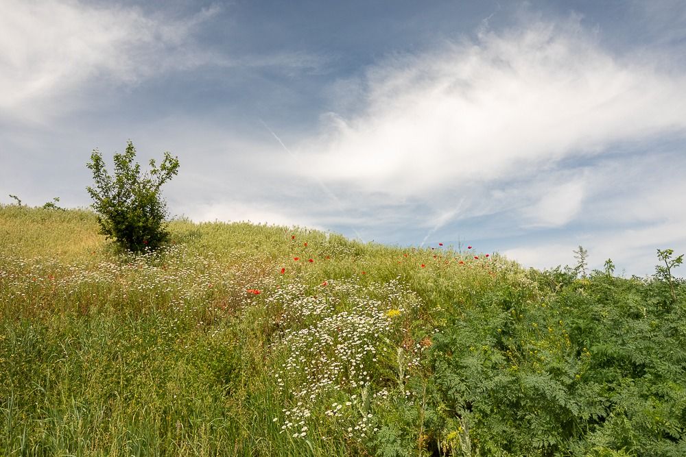 Ein kleiner Hügel, den Soldaten einst für ihre Schießübungen nutzten, wir Kinder rodelten im Winter von ihm hinab. Und die weißen Kreuze des deutschen Friedhofs, die uns stumm ihre Rücken zuwenden. Dazwischen die Kaule, kleinere und größere Mulden im Boden, vor langer Zeit entstanden, als die Menschen tonhaltige Erde für die Ziegel zum Hausbau hier aushoben, und die sich bei Regen immer mit Wasser füllen. Sie stehen voller Schilf, und aus ihnen ertönt die Melodie meiner Kindheit – das Quaken von Fröschen, das Gezwitscher junger Vögel, das Summen einer Vielzahl von Insekten. Erinnerungen und Wahrnehmungen legen sich nahezu deckungsgleich übereinander.